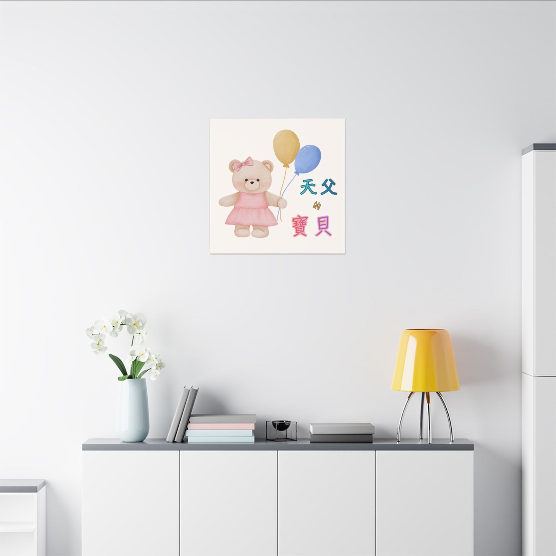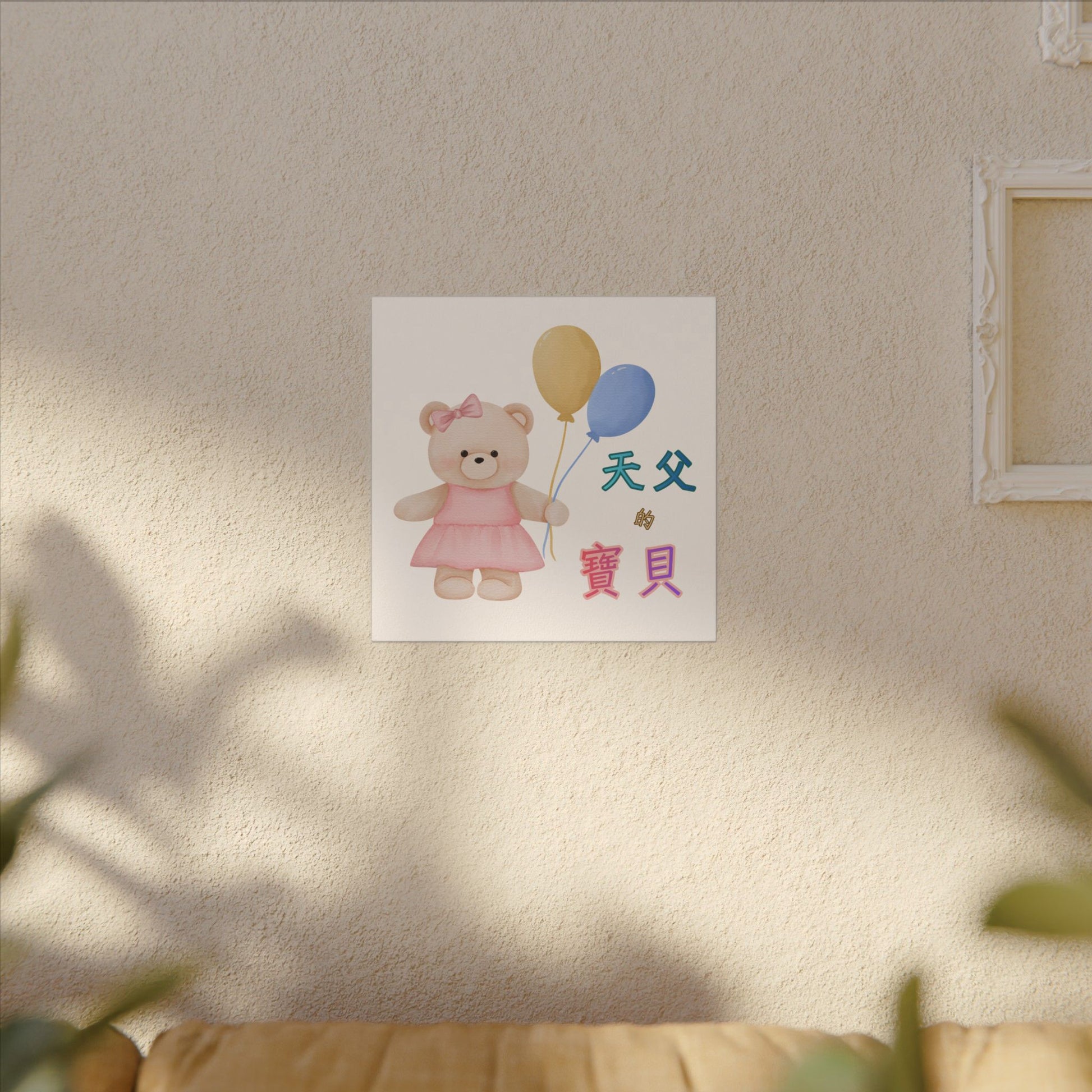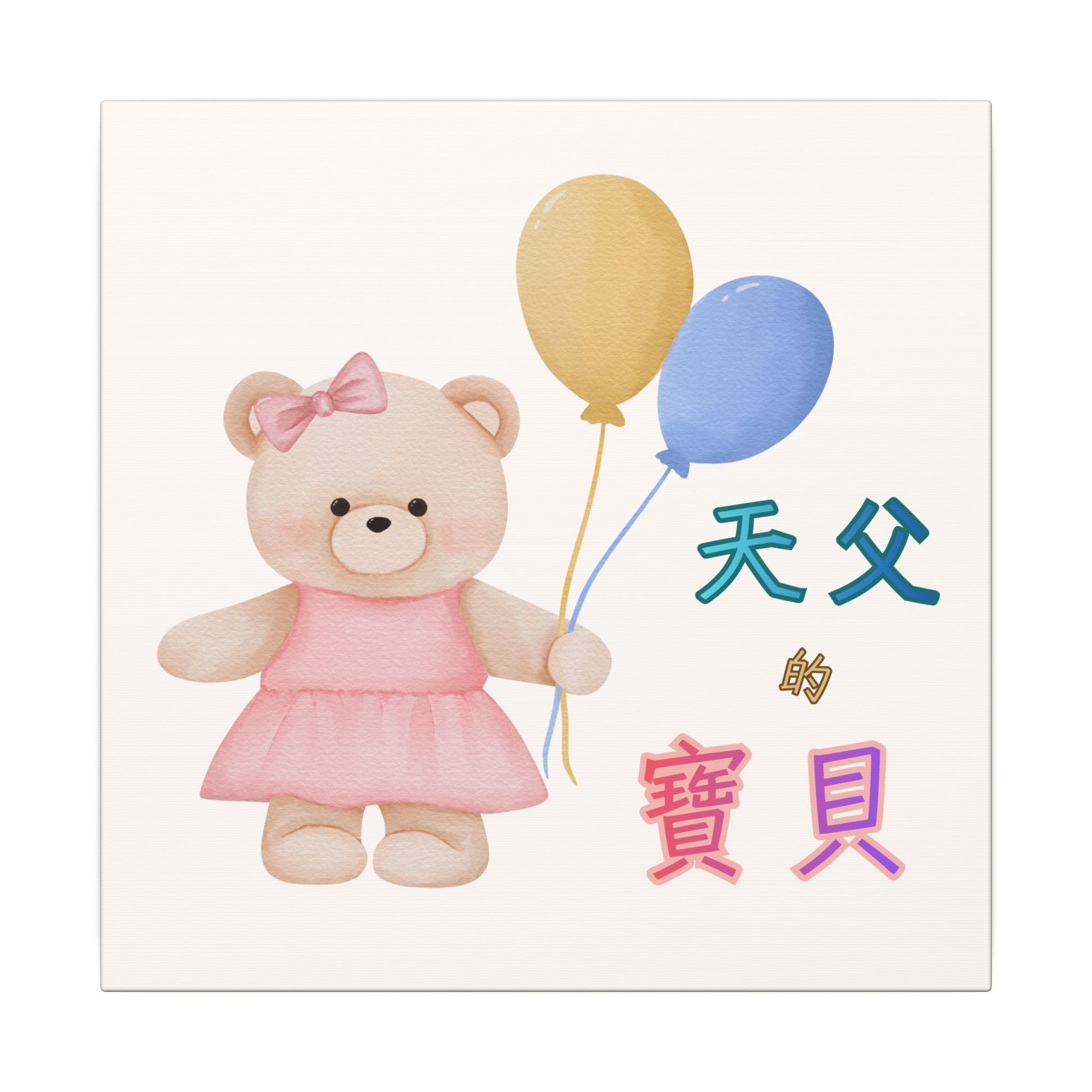 Text printed: "天父的寶貝" Each matte canvas print comes with a built-in back hanging hook for easy placement. It is made from a highly durable cotton and polyester canvas blend (9.82 oz/yd² [333 g/m²]) and features a special proprietary coating to ensure long-lasting, vibrant prints. Soft rubber dots on the back corners of the frame provide ample support and help keep the artwork stable.