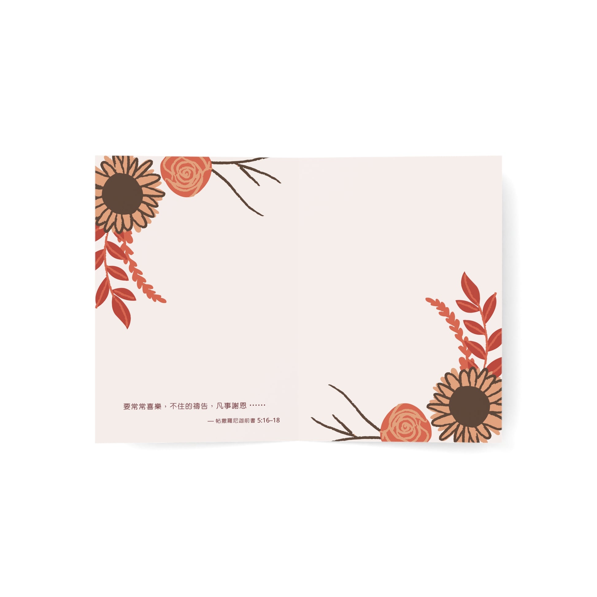 - 內部左面印字:“要常常喜樂,不住的禱告,凡事謝恩 ⋯⋯ — 帖撒羅尼迦前書 5:16–18”